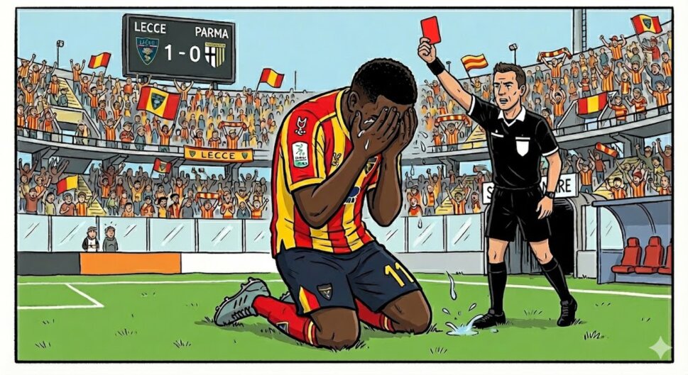 Pellegrino firma il 2-1 definitivo al Via del Mare; i salentini vanno in tilt e chiudono in nove uomini.